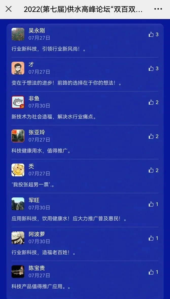 在本次评中,通过主办方、各企业火热的传播、拉票,在7月27到8月2日短短7天的投票截止时间里,所有入围“决赛圈”的企业累计亮灯31888次,浏览量超5万。传播、拉票的过程,也是企业搭建一个自我代言、自我宣传的平台的过程,主办方也希望通过网络互动,使大众更关注水司企业的发展,更关注供水事业。