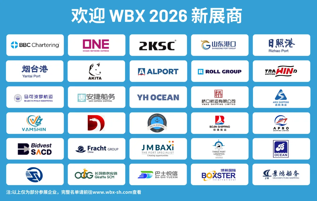 BBC,ONE,2K Shipping,秋田泛太,Roll Group,信风海运,马可波罗,安捷船务,YH OCEAN,桥口航运,启航海运,萬輪興班輪,龙腾海运,Delta Shipping,伯锦航运,Apro Shipping,Bidvest等航运企业将在WBX首次展出。