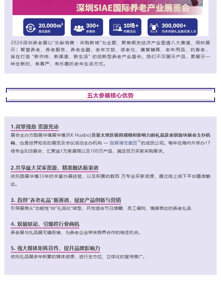 2026深圳国际养老产业展览会(SIAE)将于4月25日至28日在深圳国际会展中心(宝安)16号馆举办。展会以“乐龄消费·采购新域”为主题,聚焦智慧养老、适老化改造、康复辅具、老年用品等银发经济八大核心赛道。展览面积20,000平方米,汇聚300余家展商及30,000名专业观众,并共享同期礼品展超30万买家资源。致力于打造集产品展示、渠道对接、趋势洞察于一体的创新型养老产业平台,推动老年生活品质与产业升级。
