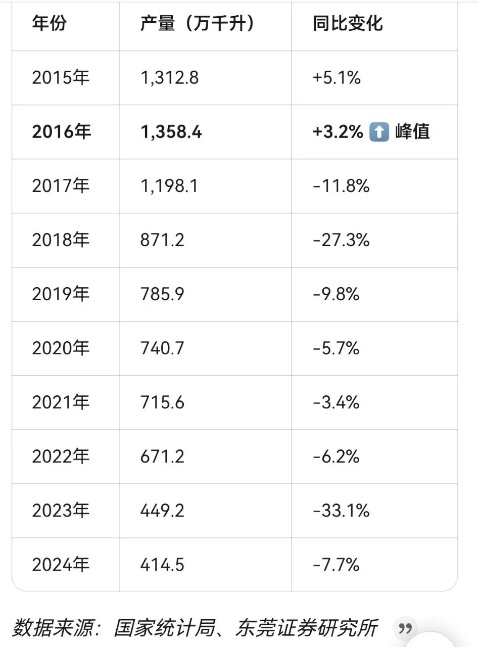 - 累计降幅:从2016年峰值到2024年,产量累计下降69.5%(约944万千升)