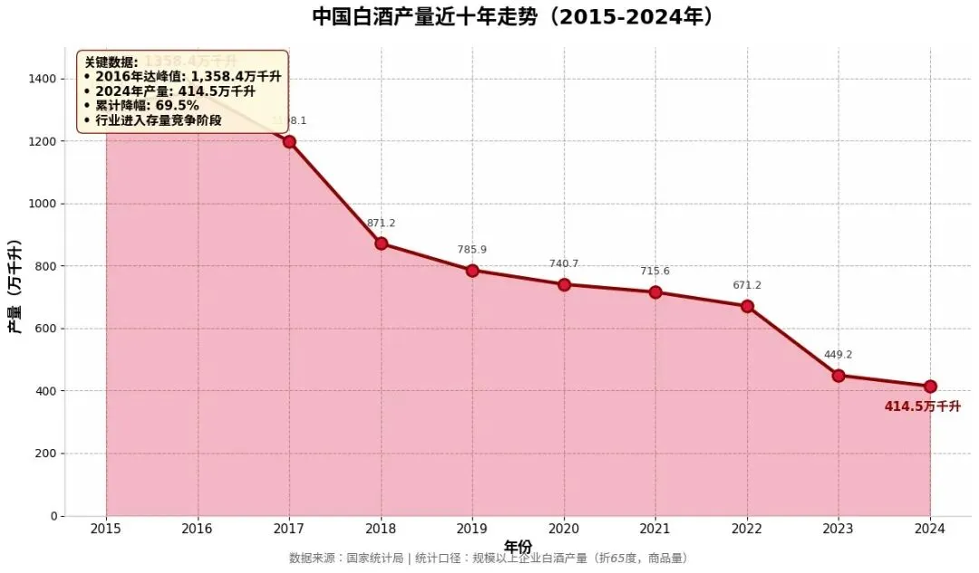 4. 深度调整期(2023-2024年):2023年因统计口径调整(白酒新国标实施),产量骤降至449.2万千升,2024年进一步降至414.5万千升。