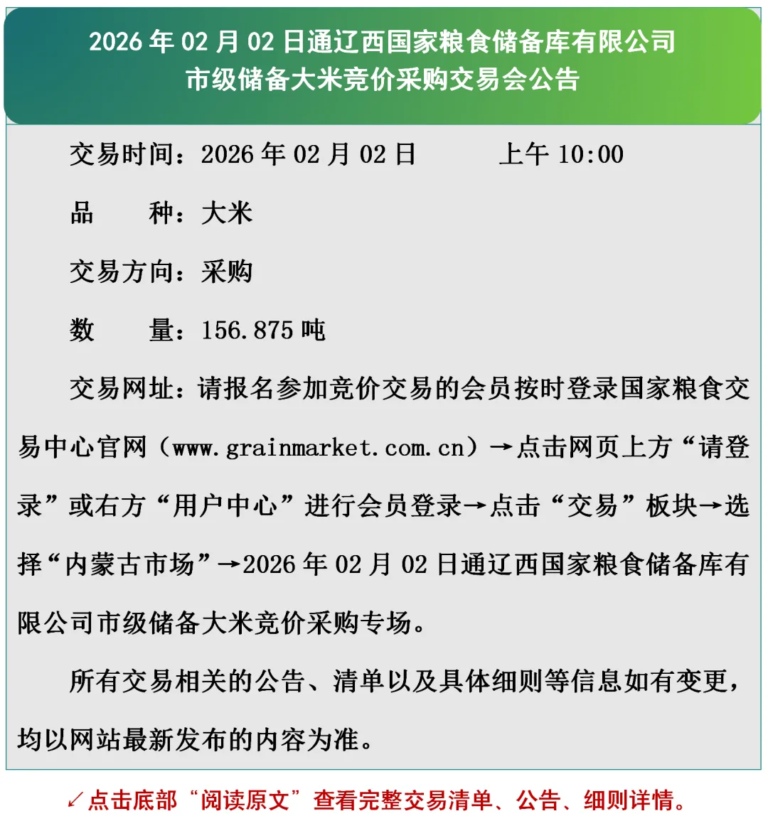 2026年02月02日通辽西国家粮食储备库有限公司市级储备大米竞价采购交易会公告