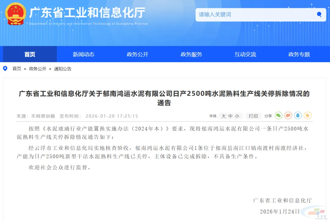 1月24日,广东省工业和信息化厅发布《广东省工业和信息化厅关于郁南鸿运水泥有限公司日产2500吨水泥熟料生产线关停拆除情况的通告》。