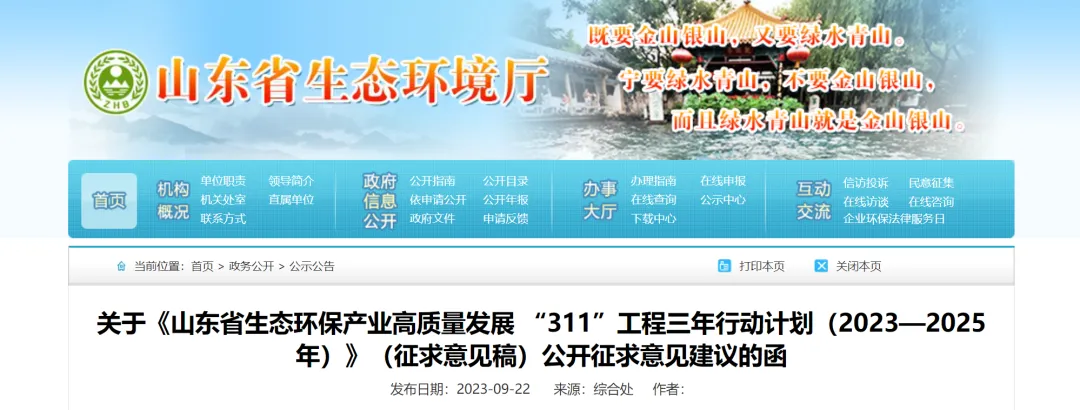 近日,山东省生态环境厅发布了《山东省生态环保产业高质量发展 “311”工程三年行动计划(2023—2025年)》(征求意见稿)。