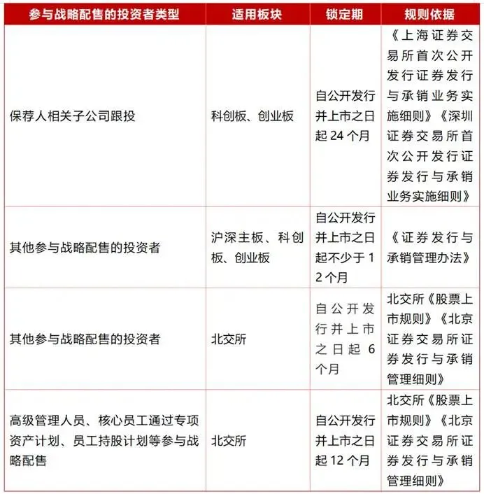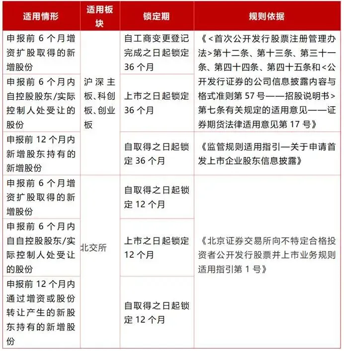 IPO限售股份包括IPO原股东限售股份和IPO机构配售股份两部分。根据沪深北交易所《股票上市规则》,IPO各类股东的股份锁定要求如下: