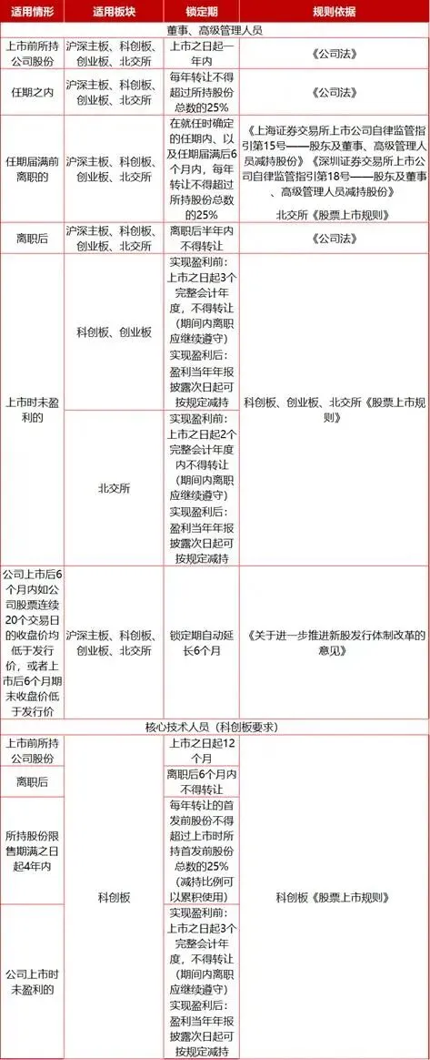 各板块对于董事、高级管理人员、核心技术人员(科创板要求)所持上市前股份锁定期的规则如下表所示: