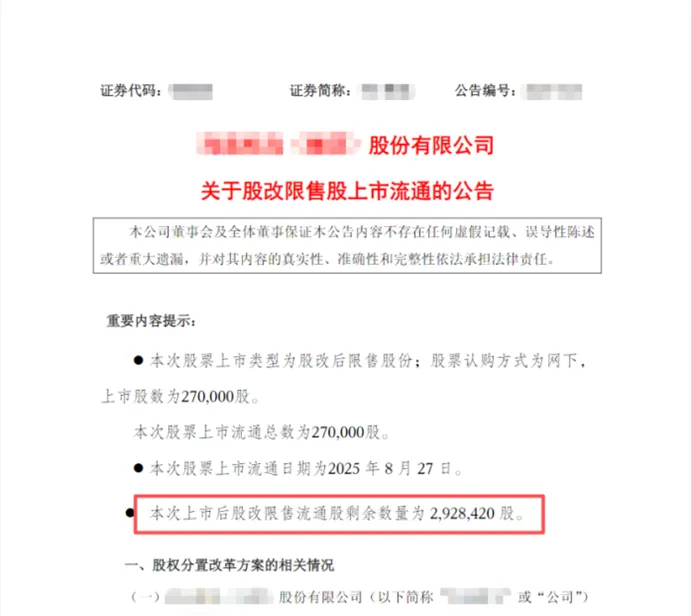 自开始股权分置改革至今,绝大部分国有企业已完成改革。但市面上仍存在改革后遗留的部分限售流通股,以下图为例,该公司在2025年8月21日发布了《关于股改限售股上市流通的公告》,公告提及本次上市后股改限售流通股剩余数量仍有2,928,420股: