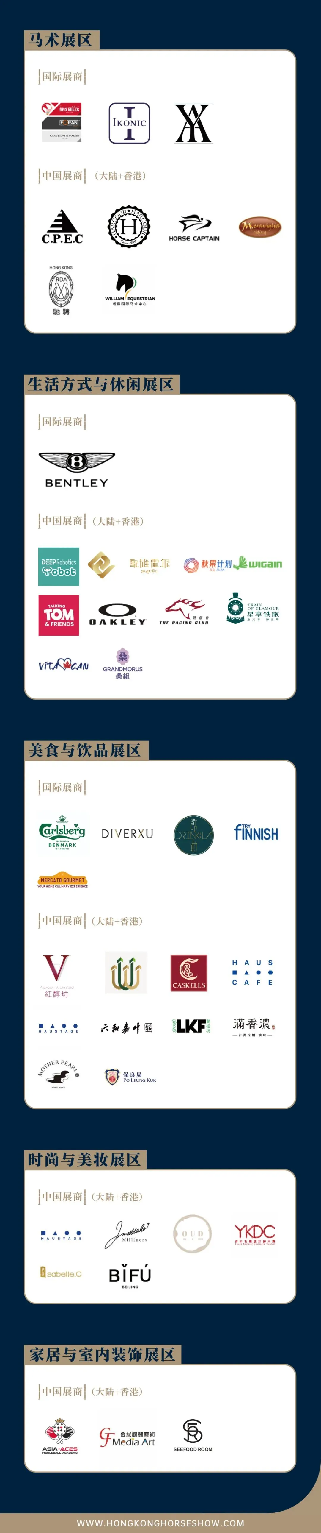 本次博览会共设五大展区,分别为马术展区、生活方式及休闲展区、美食与饮品展区、时尚与美妆展区和家居及室内设计展区。截至目前已吸引宾利、LG、小鹏汽车、云深处等近50家国际知名品牌参展/赞助,覆盖智能科技、新消费、高端制造等多领域,打造了中国品牌深耕港澳、走向世界的核心跳板。