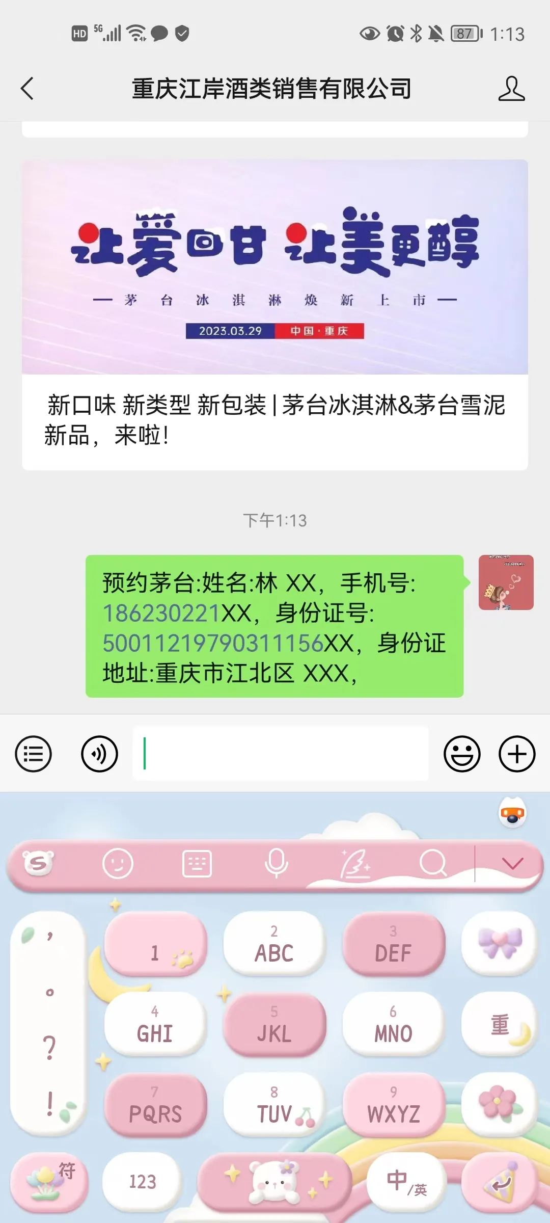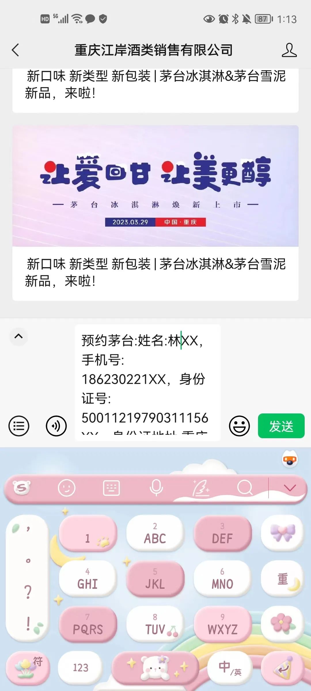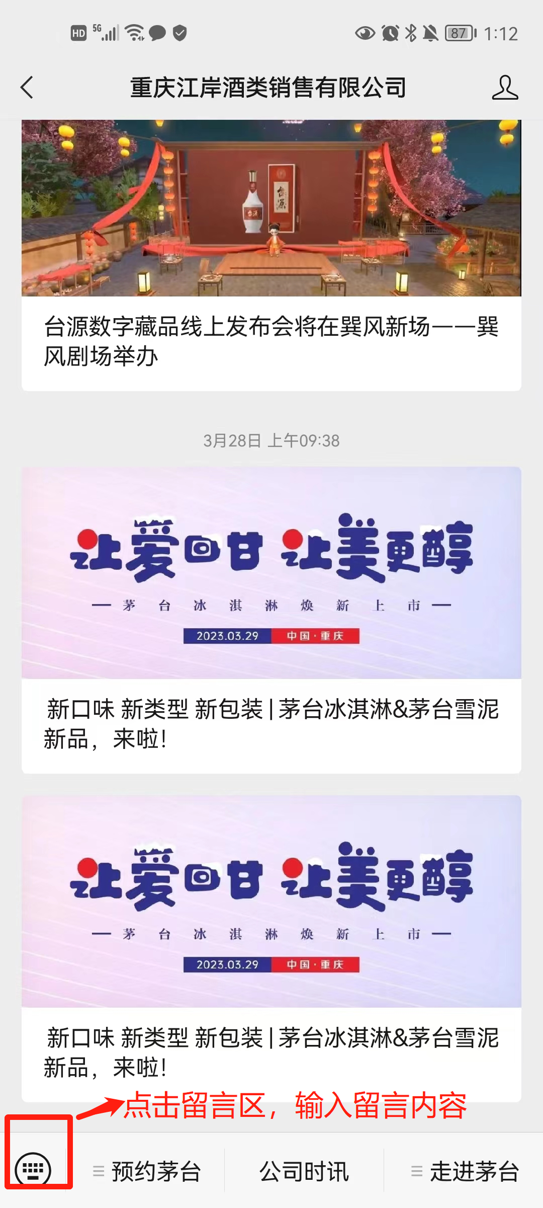 二、通过重庆江岸酒类销售有限公司微信公众号留言(留言内容发送:预约茅台,内容包括:姓名、手机号、身份证号码、身份证地址)(需年满18周岁)。