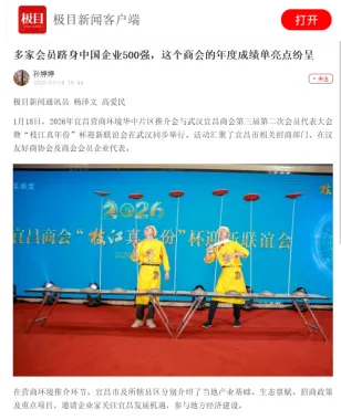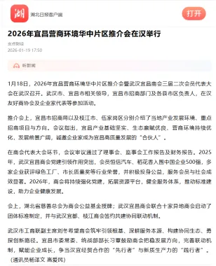 1月18日,2026年宜昌营商环境华中片区推介会、武汉宜昌商会三届二次会员代表大会暨“枝江真年份”杯迎新联谊会在汉成功举办,引发湖北日报支点财经、湖北电视台、极目新闻、三峡日报、香港经济导报等媒体权威聚焦报道,商会及相关会员企业通过网站、公众号、视频号、朋友圈、微信群等进行了广泛宣传推介,多渠道传播使得“汉宜经济协同发展”成为热议话题。