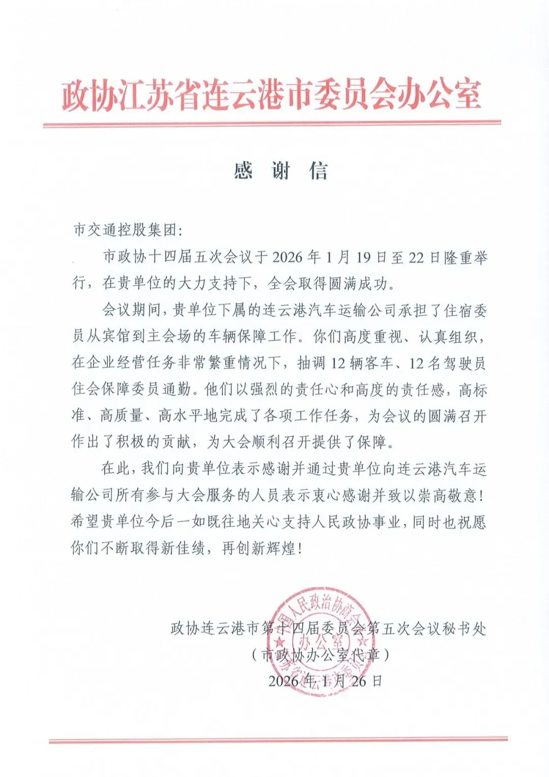 近日,连云港市交通控股集团收到了连云港市政协的感谢信,对交通控股集团和集团权属连云港汽车运输有限公司在市政协十四届五次会议期间的组织保障工作给予了高度评价。