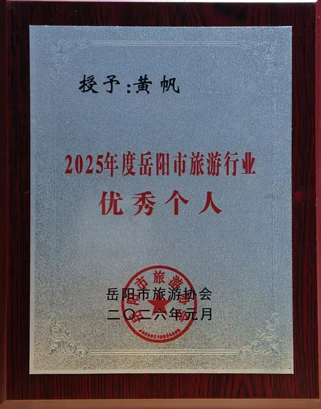 2026年1月28日,岳阳市旅游协会隆重举办“2026岳阳市旅游协会年会暨2026文旅新品发布会”,本次会议对为岳阳市文旅事业作出突出贡献的单位及个人予以表彰。岳阳市瓴岳文化旅游有限公司荣获“2025年度岳阳市旅游行业先进单位”称号,公司总经理黄帆同时获评“2025年度岳阳市旅游行业优秀个人奖”。