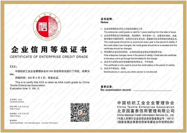 (6)年度复审:有效期内每年进行一次复审。年度复审中信用等级存在变动(上调或降低信用等级)的企业,中纺企协将向社会公示其信用等级的变动结果并更换证书。