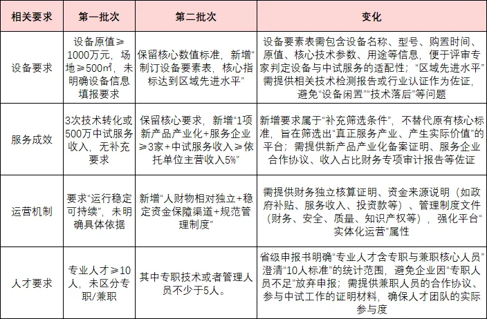 首批申报中发现部分企业存在“设备与中试需求不匹配”“技术转化案例佐证不足”“平台运营机制不清晰”等问题,第二批申报通过细化设备要素表、补充成效佐证要求、明确运营机制标准,针对性解决上述问题。