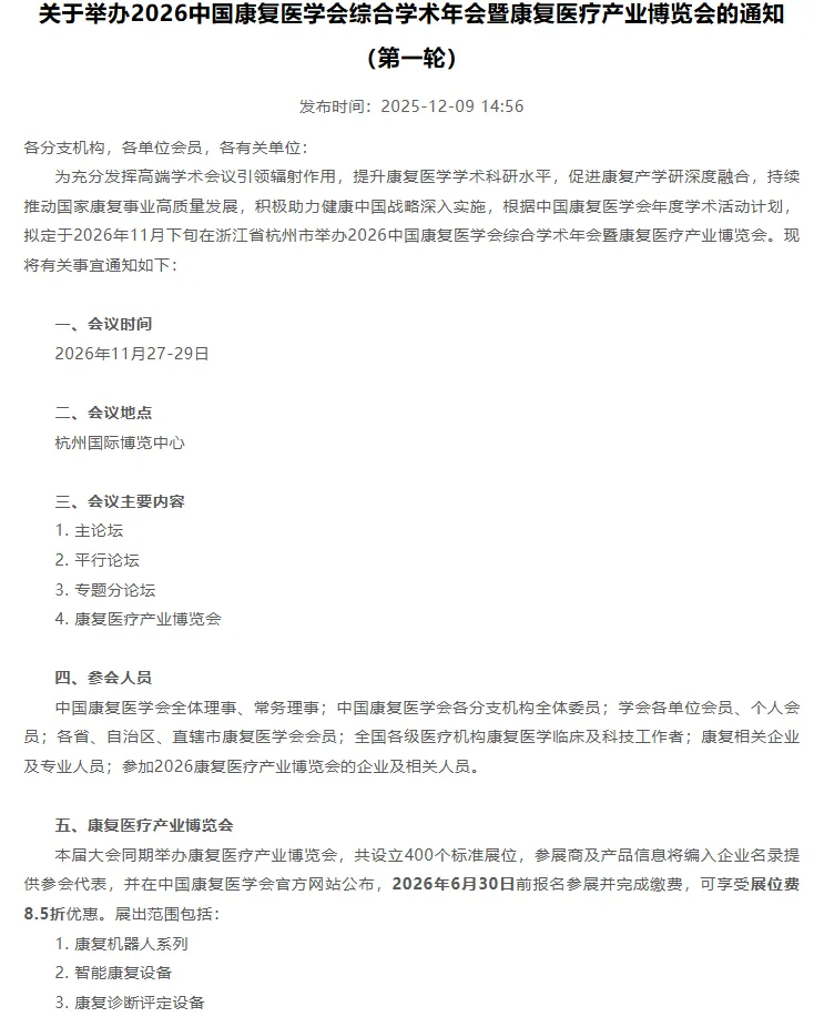 为充分发挥高端学术会议引领辐射作用,提升康复医学学术科研水平,促进康复产学研深度融合,持续推动国家康复事业高质量发展,积极助力健康中国战略深入实施,根据中国康复医学会年度学术活动计划,拟定于2026年11月27-29日在浙江省杭州市举办2026中国康复医学会综合学术年会暨康复医疗产业博览会。