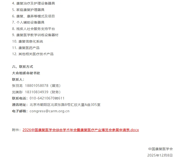 本届大会广开展位,以广邀参展商展出康复医疗新进展,且2026年6月30日前报名参展并完成缴费,可享受展位费8.5折优惠。