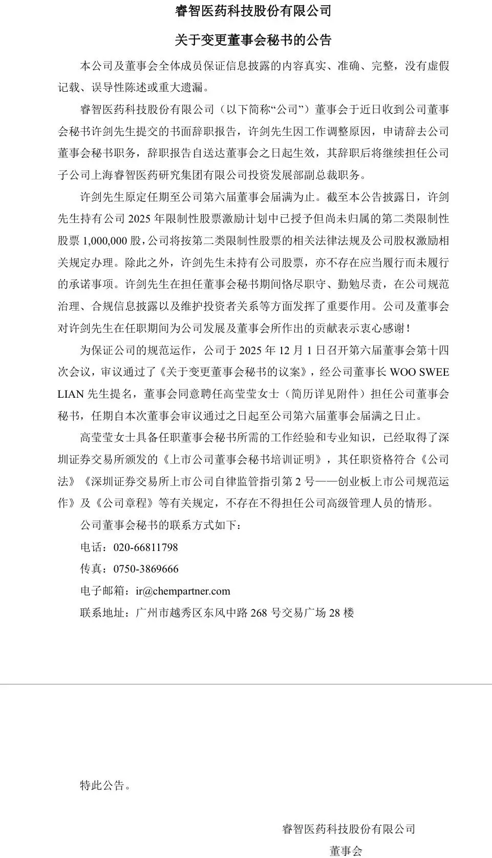 2025年12月1日,睿智医药发布《关于变更董事会秘书的公告》,宣布公司董事会审议通过议案,同意聘任高莹莹为公司新任董事会秘书,任期自本次董事会审议通过之日起至公司第六届董事会届满之日止。公告同时披露,前任董秘许剑因工作调整原因申请辞职,其原定任期至2027年11月14日,属于任期未满提前卸任。