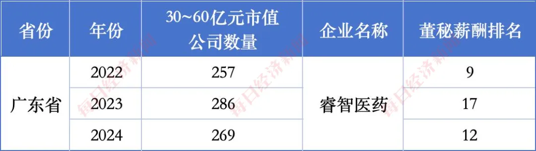 再从市值维度来看睿智医药董秘薪酬水平。分别以2022、2023、2024年12月31日为标准统计市值水平,睿智医药对应市值分别约为52.03亿元、38.23亿元和32亿元。以广东省同期30亿元至60亿元的市值水平上市公司为范围统计,睿智医药的董秘薪酬排名分别为9、17、12,排名均较靠前。