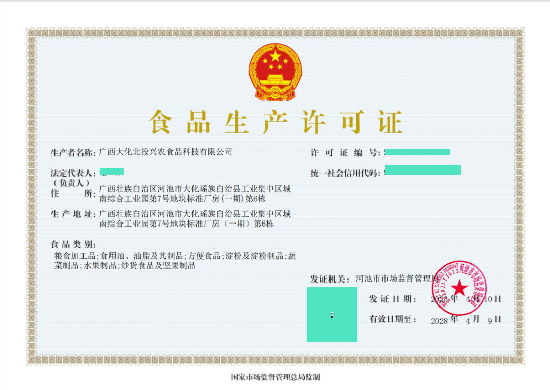 近日,由河池市食品药品认证审评中心委派的核查组到广西大化北投兴农食品科技有限公司(以下简称“北投兴农食品公司”)进行SC(食品生产许可)认证现场审核。专家组经过对生产设备、年度产值、环境控制、制度管理、产品检测、市场营销等进行严格而全面的审核,与北投兴农食品公司交流沟通,最终给予北投兴农食品公司综合得分96分的考核成绩顺利通过SC认证,并颁发证书,这标志着北投兴农食品公司在方便食品(方便粉丝、即食谷物粉、其他营养粉羹等)、淀粉及淀粉制品等产品类别的加工生产及粮食加工品、食用油、油脂及其制品、蔬菜制品、水果制品、炒货制品及坚果制品的分装上都具备了相应资质。
