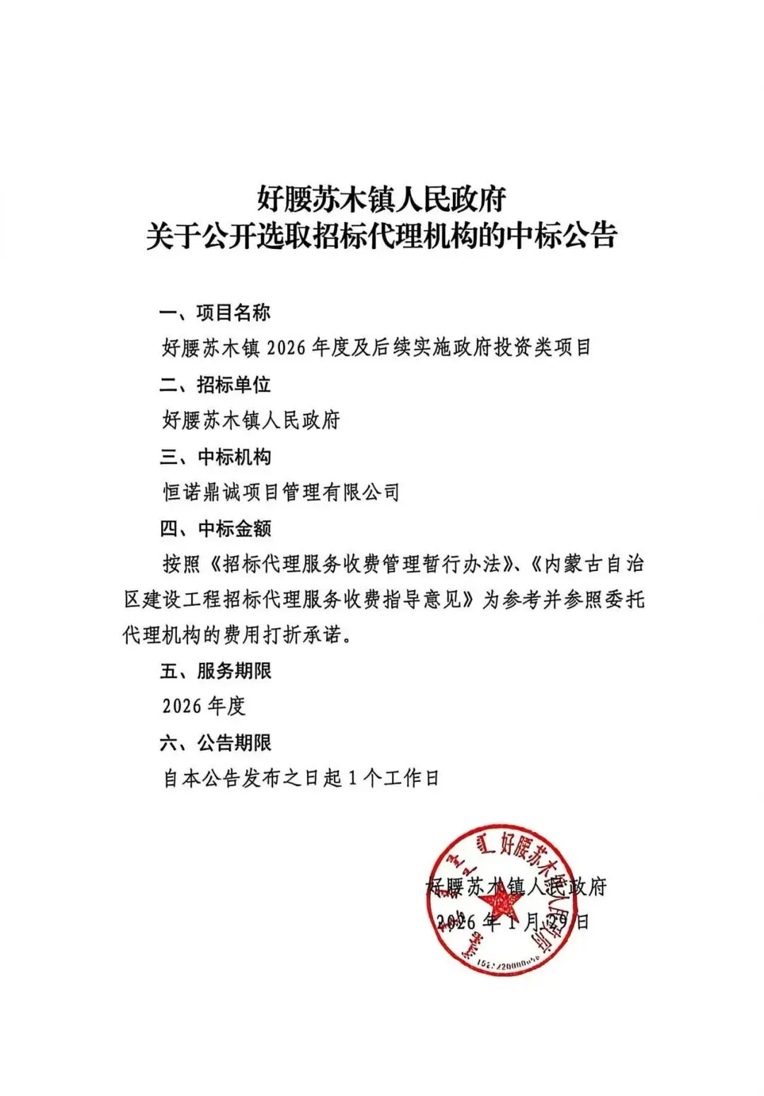 好腰苏木镇人民政府关于公开选取招标代理机构的中标公告