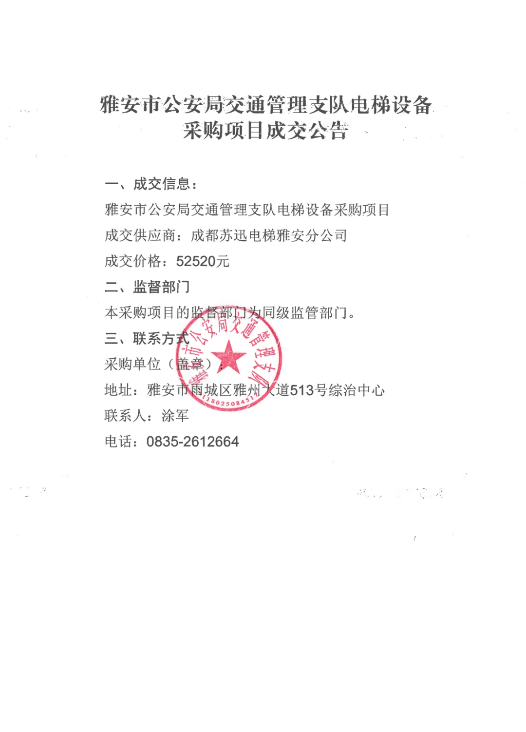 关于雅安市公安局交通管理支队电梯设备采购项目成交公告