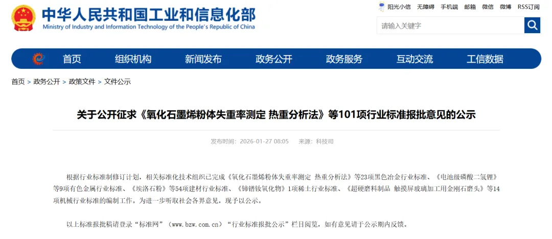 近日,《氧化石墨烯粉体失重率测定 热重分析法》等 101 项行业标准进入报批意见公示阶段,涵盖黑色冶金、有色金属、建材、稀土、机械五大领域。其中,针对氧化石墨烯粉体的热重分析标准,不仅填补了该材料测试领域的技术空白,更将为新能源、电子、新材料等产业的质量管控提供关键依据。无论是相关生产企业、检测机构,还是上下游应用端,都需及时关注标准动态,提前做好合规准备。