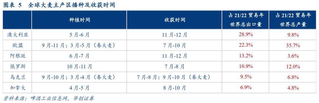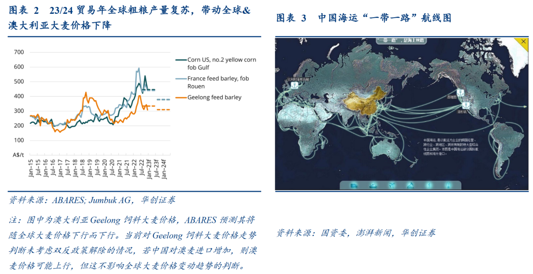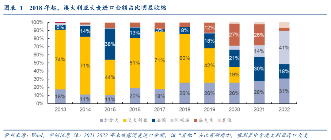 双反政策促使我国大麦进口转向欧美,但进口澳麦运输成本更低,若政策取消则大概率采购重新转向澳麦。我国于2018年11月对澳麦启动进口反倾销调查,并于2020年5月宣布征收73.6%反倾销税、6.9%反补贴税。国内企业采购需求逐步转向欧美各国,澳麦进口金额占比从2017年的71%下行至21/22年几乎未有进口,而2022年加拿大、法国、阿根廷进口金额分别占31%/18%/41%。但澳大利亚是全球最大的大麦出口国(出口金额占比近30%),且从澳大利亚进口的海运成本明显低于欧美(参考搜航网数据,标准集装箱成本约为加拿大、欧洲、南美东部的50~80%、30~50%、20-30%),因此我们预计,若双反政策取消,中国大麦采购大概率重新转向澳大利亚。
