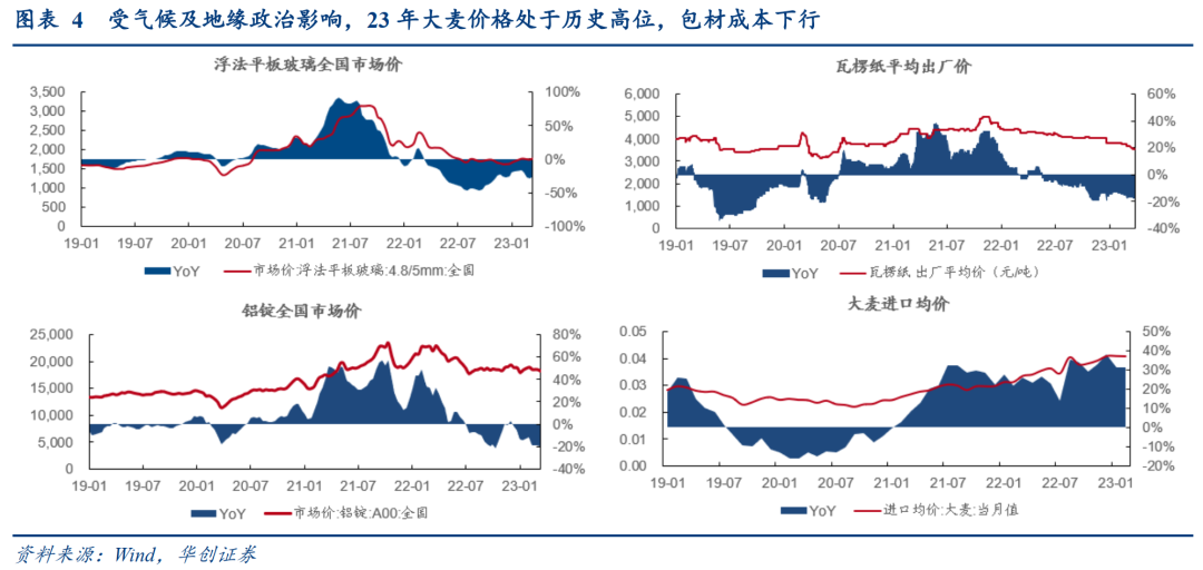 短期看,23年大麦锁价已基本完成,但包材价格下行主导盈利加速释放。啤酒企业通常在每年年底至年初进行大麦锁价,目前大部分酒企已完成23年锁价,预计大麦成本涨幅近20%。故本次事件对23年酒企大麦成本影响有限,但铝材、纸箱等包材价格陆续下行,将主导23年酒企成本压力缓和。以华润为例,我们预计23年公司成本涨幅从约5-7亿元,再次下修至基本持平,测算若吨价同增中高个位数,吨成本基本持平,则毛利率有望同增3pcts左右,支撑盈利快速释放。