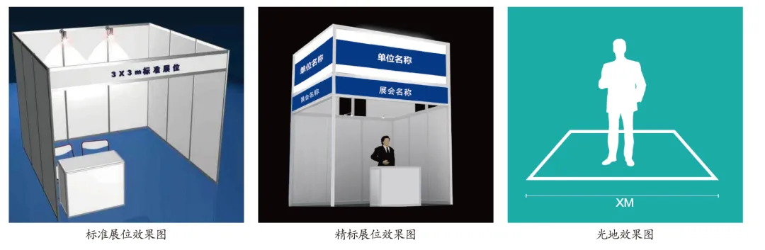 2. 精标展位基本配置:3m×3m展位(包括精装标准展台、布幅广告门楣、地毯、一桌两椅、门楣射灯、展位射灯、220V电源插座);