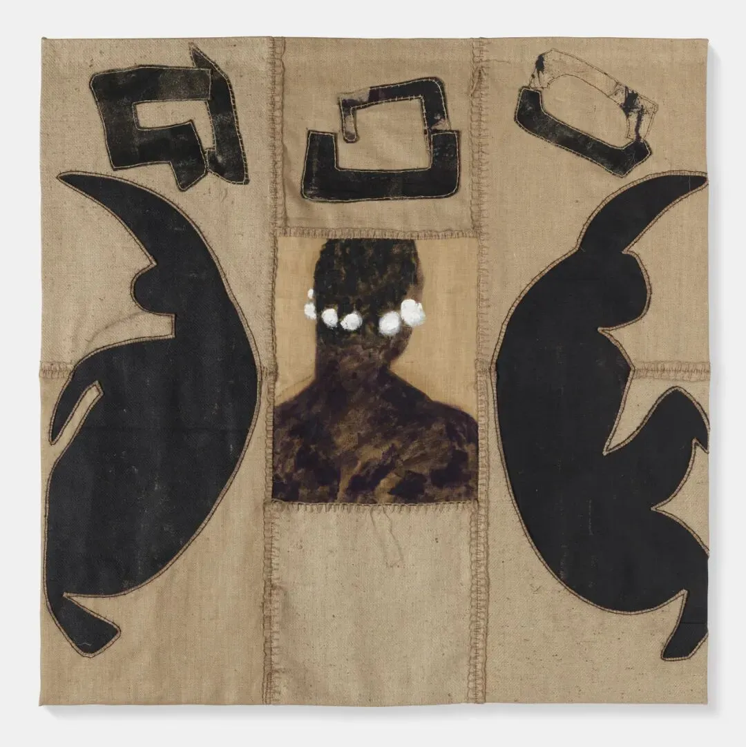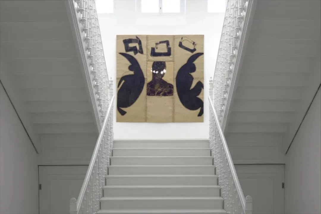 巴林顿选择粗麻布而非普通画布作为绘画材料,这一决定与他标志性的多媒体创作手法一脉相承。这种材料主要用于制作可可豆和咖啡豆的麻袋,但也深受保罗·高更和阿尔贝托·布里等艺术家的青睐。“我能感受到每一种材料。我力求在选择材料时都非常谨慎,”艺术家解释道。粗糙的织物赋予作品一种触感上的重量,令人联想起挂毯这种媒介。历史上,挂毯价值连城,曾被用来传递权力、地位或家族历史,传统上人们会将挂毯从一个家带到另一个家,代代相传。“我非常喜欢挂毯与旅行相关的这种理念。继泰特美术馆和诺丁山的卡车展览之后,在这次展览中,我试图让作品给人一种重量感,仿佛它们天生就应该挂在墙上。”