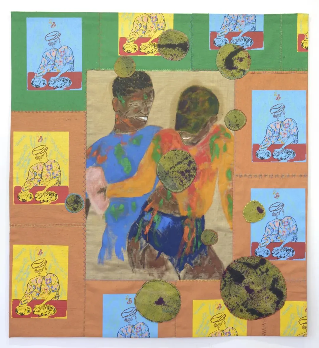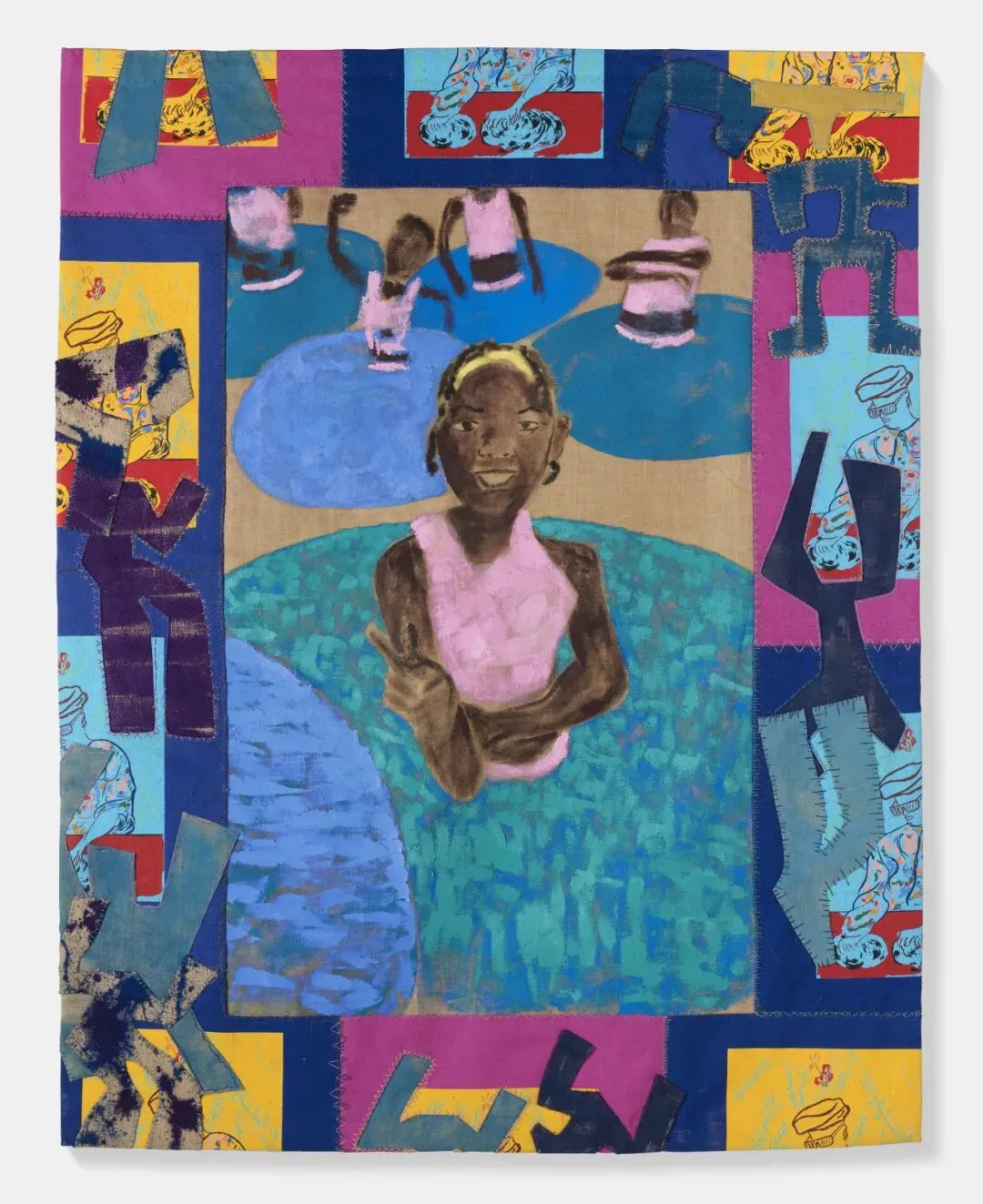 这些宛如织毯般的画布,其边框由丝网印刷的人物肖像构成,描绘的是牙买加最重要、最受推崇的舞厅音乐人之一的布朱·班顿(Buju Banton)。画中他出现在唱盘前,以细腻而图形化的笔触呈现,背景则是明亮的方形色块,灵感来自巴林顿对约瑟夫·阿尔伯斯(Josef Albers)作品的欣赏。画面中缝贴的纺织剪裁元素取材自库巴织锦(Kuba cloth)复杂而精巧的图案体系,同时也回溯了由他家族中的女性世代相传的、具有性别分工意味的传统手工技艺,以及加勒比地区以布料与缝纫为媒介的艺术表达历史。
