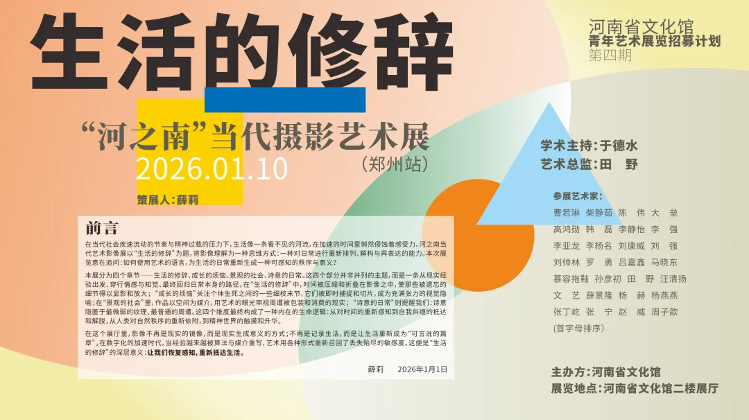 在当代社会疾速流动的节奏与精神过载的压力下,生活像一条看不见的河流,在加速的时间里悄然侵蚀着感受力。河之南当代艺术影像展以“生活的修辞”为题,将影像理解为一种思维方式:一种对日常进行重新排列、解构与再表达的能力。本次展览意在追问:如何使用艺术的语言,为生活的日常重新生成一种可感知的秩序与意义?