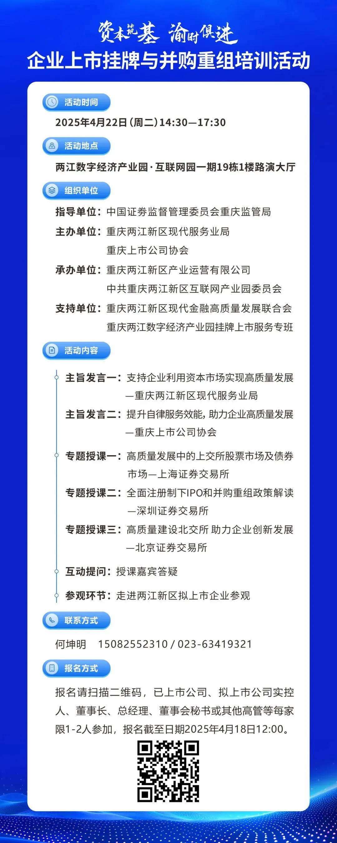 为围绕资本市场做好金融“五篇大文章”,推动科技创新企业登陆资本市场,提升资本运作能力,促进优质企业高质量发展。在重庆证监局指导下,重庆上市公司协会联合两江新区现代服务业局在互联网产业园共同举办“资本筑基,'渝’时俱进”企业上市挂牌与并购重组培训活动,现将活动安排通知如下: