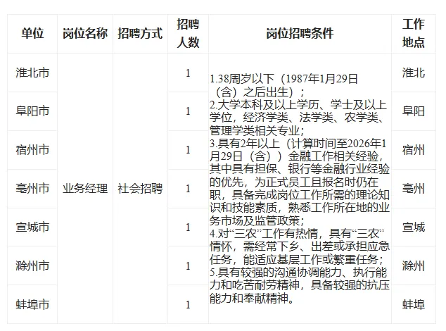 本次计划社会招聘7名工作人员,专职负责江淮粮仓担保公司市县业务工作。具体岗位条件如下: