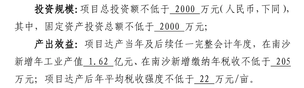 项目总投资不低于2000万,项目达产当年及后续任一完整会计年度,在南沙新增年工业产值1.62亿,年税后不低于205万元,年平均税收强度不低于22万/亩。