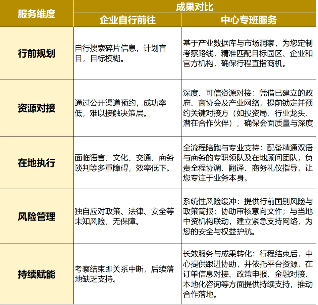 我们深知,一次成功的出海考察,其核心价值在于 “精准的连接、深度的对话与可落地的成果”。这正是中心专业化服务致力于为您提供的根本保障。