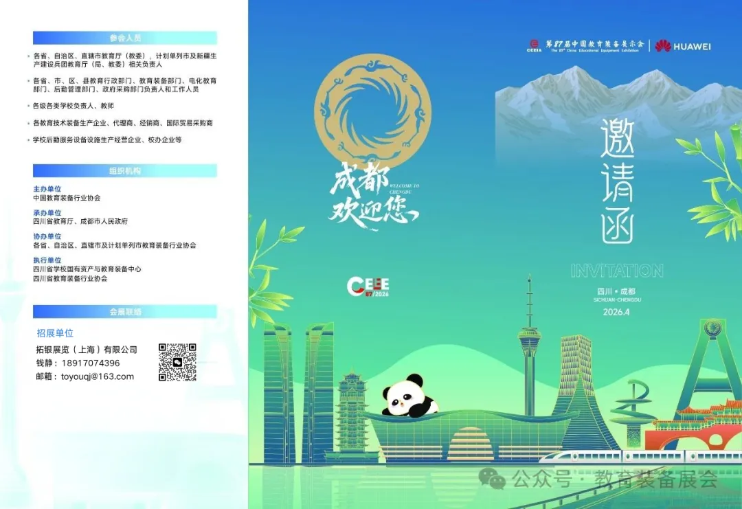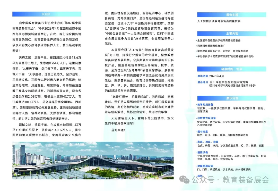 由中国教育装备行业协会主办,四川省教育厅、成都市人民政府共同承办的“第87届中国教育装备展示会”,将于2026年4月24日至26日在成都·中国西部国际博览城隆重举行。87届教装展将聚焦全学段教育需求,集中呈现学前教育、基础教育、职业教育、特殊教育及高等教育等领域的前沿教育装备。展品涵盖各级各类学校所需的创新产品、先进技术及优质服务,致力于为教育行业搭建资源共享与交流合作的专业平台。自1980年创办以来,中国教育装备展示会历经86届积淀与发展,始终紧扣时代脉搏,深度契合国家教育政策导向,精准聚焦行业热点趋势。展会持续推动参展企业迭代升级、参展产品创新优化,凭借其权威性与前瞻性,成为引领教育装备市场发展的 “风向标”。作为我国教育装备领域规模最大、影响力最广、专业性最强的标杆展会,它不仅见证了行业的成长,更推动着教育装备产业的革新。多年来展会屡获殊荣,成绩斐然。连续斩获 “中国行业品牌展会金手指奖”;2019 年,被商务部流通产业促进中心与中国绿色会展联盟列为 “绿色会展优秀典型案例”;2020年,荣获全国会展工作委员会、中国会展业专家委员会授予的 “中国会展优秀品牌大奖”。此外,还获得中央和国家机关妇女工作委员会颁发的 “中央和国家机关三八红旗集体” 称号,充分彰显其在行业内外的卓越影响力与示范价值 。2025年10月24-26日在青岛世博城国际展览中心召开的第86届中国教育装备展示会,展示面积12万平方米,参展商家约800余家,到场观众20万余人次。"晓看红湿处,花重锦官城"。四月蓉城,春意盎然。我们将以蜀绣般细密的接待,都江堰般奔涌的热情,期盼您相约成都,感受这座城市的文脉传承与创新激情,共抒教育情怀,共谱时代华章!天府秀色迎天下。雪山下的公园城市,烟火里的幸福成都欢迎您!