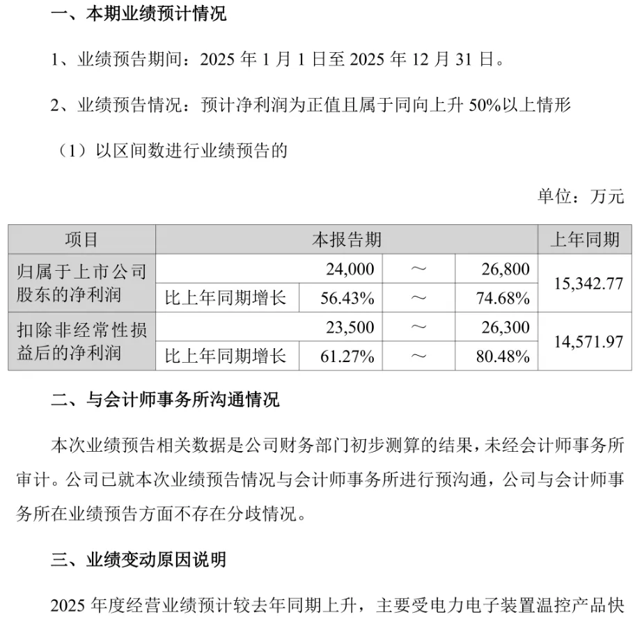 1月21日,同飞股份发布2025年度业绩预告,预计归属于上市公司股东的净利润为2.40亿元-2.68亿元,比上年同期增长56.43%-74.68%。