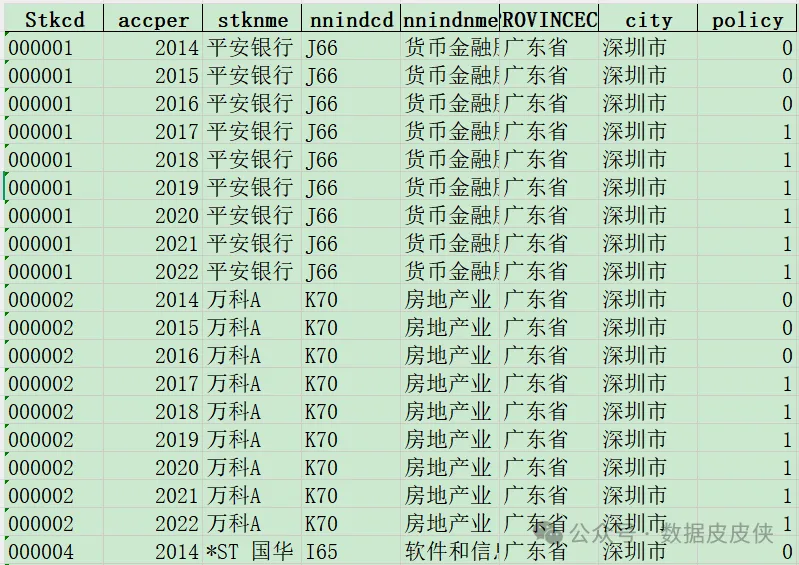Stkcd | accper | stknme | nnindcd | nnindnme | PROVINCECD | city | policy |