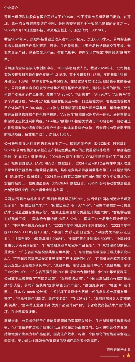 随后,公司相关负责人向与会来宾详细介绍了康冠科技在技术研发、工业设计、生产制造及市场销售等情况。康冠科技采购经理杜艺琨介绍了康冠的供应商选拔政策并公布了电子物料采购清单。另外,皓丽智能显示科技有限公司总经理黄山也分享了公司发展、产品应用领域、技术方案等情况。