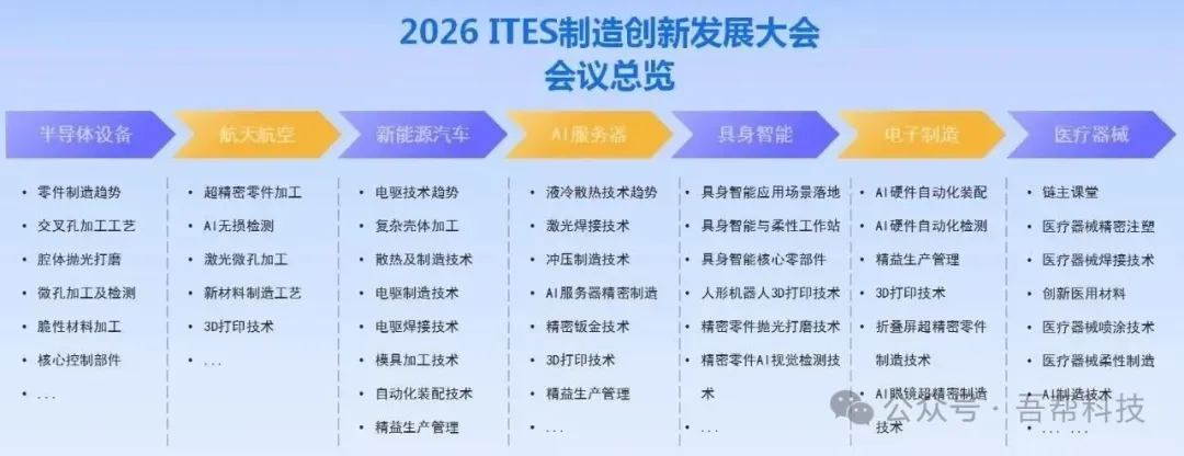 作为2026 ITES“展+会”生态的核心组成,同期系列会议聚焦更行业核心零部件及先进工艺应用,精准覆盖半导体设备、新能源汽车、AI 服务器、具身智能、电子制造、医疗器械、航空航天7大热点赛道,打造80余场高质量主题论坛。