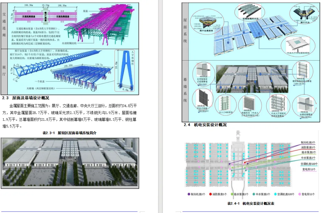 项目总建筑面积 478613 ㎡;主要施工内容为展馆区及能源站,展馆区建筑面积 476764 ㎡, 最大单跨跨度为 84 米,最高层数为 3 层,最大高度为 34 米,最大基坑深度 12 米,结构类型:钢结构,能源站建筑面积为 1849 ㎡,结构类型:框架结构。