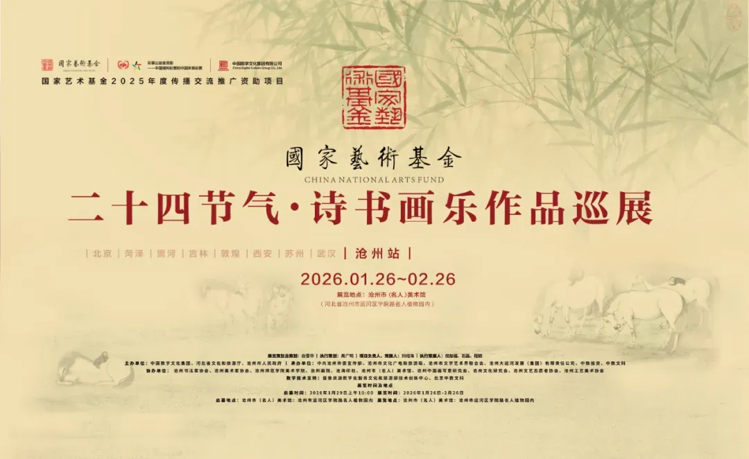 国家级艺术盛宴添彩新春,非遗文脉浸润狮城大地。国家艺术基金传播交流推广资助项目“二十四节气·诗书画乐作品巡展”沧州站,于2026年1月29日上午10时在沧州市(名人)美术馆开幕。此次展览自1月26日至2月26日免费向公众展出,为新春佳节的狮城奉上一场融文化底蕴、艺术美感与数字创新于一体的高质量文化盛宴。
