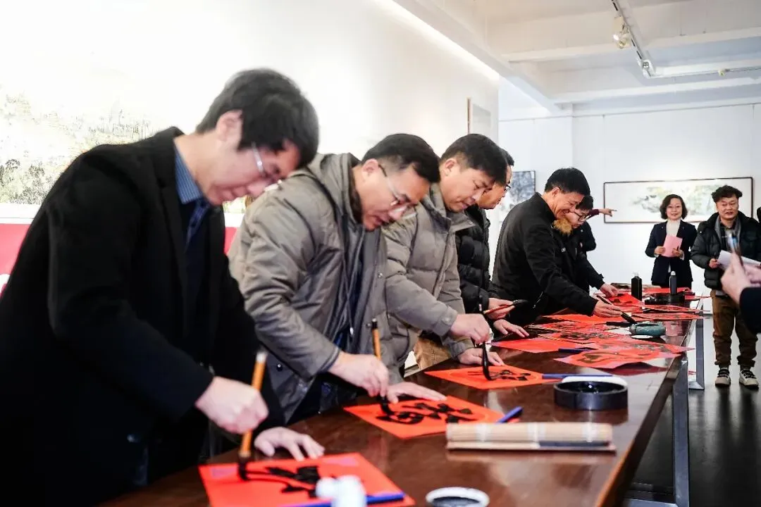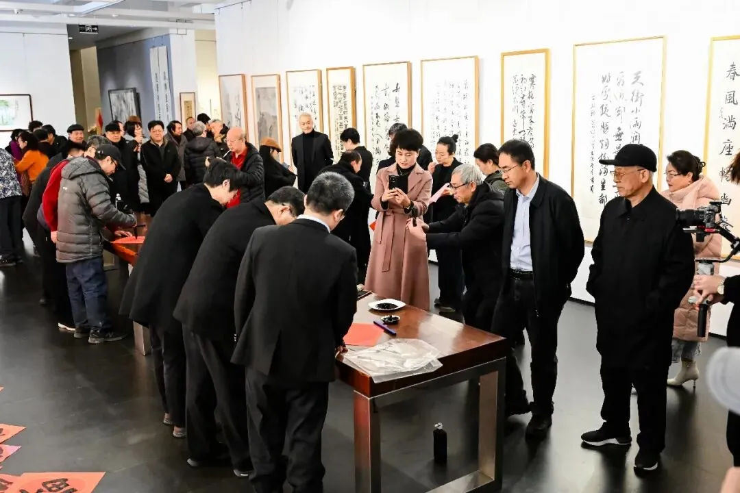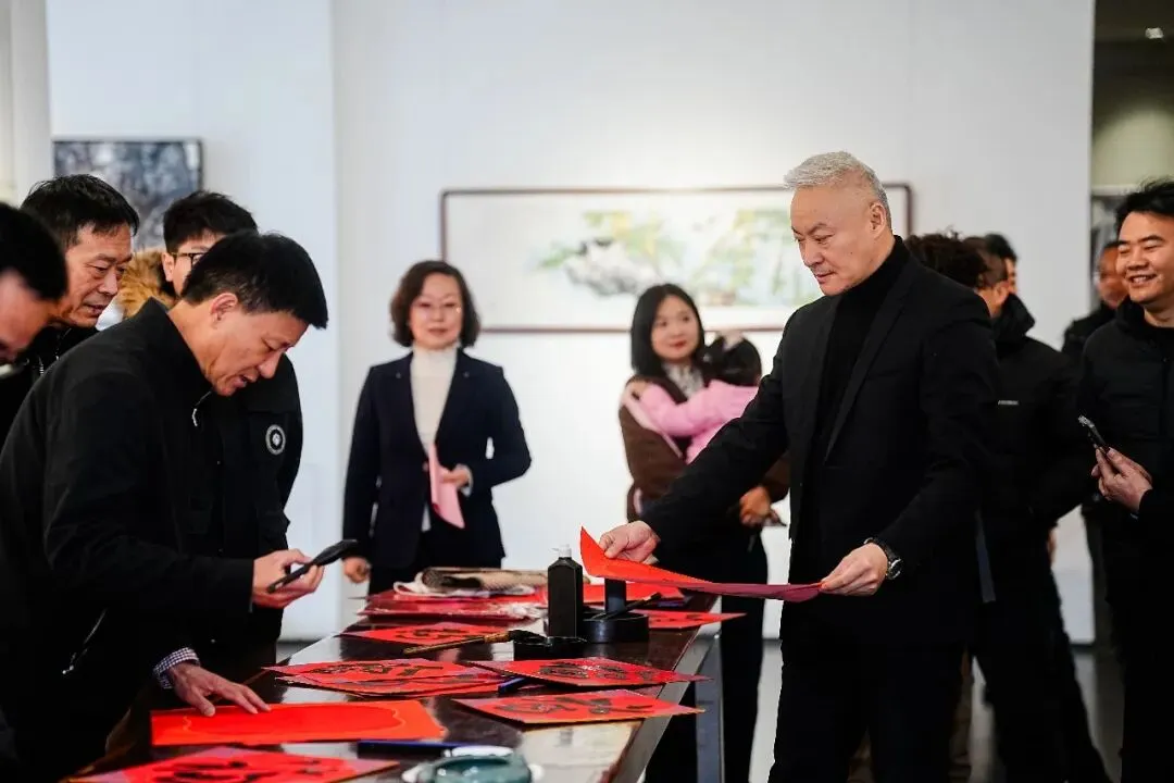 展览现场特举办文化惠民专场,邀请国内书画名家王学岭、刘绍海、倪加福等与沧州本土书画名家白清安、冯青春、李德瑞、吴英昌、黄子麟、宋德建等联袂书写,红纸铺展如霞,笔墨酣畅淋漓。艺术家们凝神挥毫,楷书端庄隽秀、行书飘逸灵动、隶书古朴厚重,一副副春融气节、意趣与新春祝福于一体的春联跃然纸上,“春融节气千门暖,福满狮城万户欢”等联语饱含期许;一个个饱满圆润的“福”字力透纸背,或端庄大气或灵动精巧,承载着浓浓的年味儿与美好祝愿。