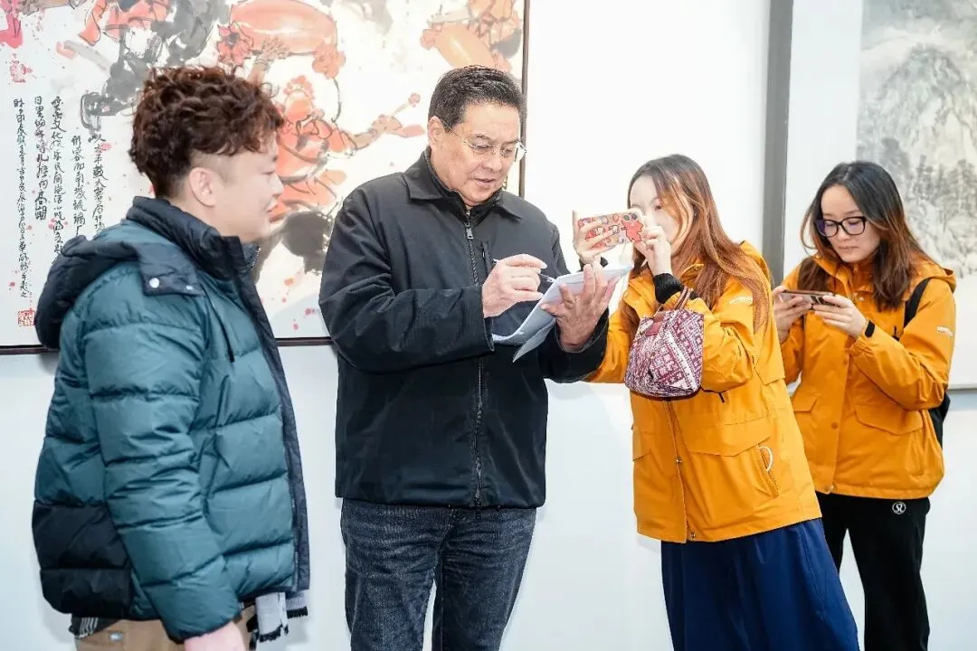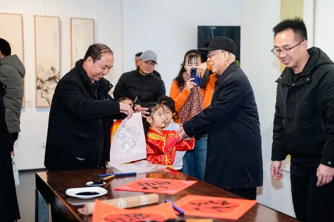 市民们闻讯而来,或驻足观摩笔墨流转的雅致,或按需求联、喜领福字,老少相携间笑意盈盈,墨香与欢声交织成冬日里最暖的文化图景,更有爱好者趁机请教笔法,艺术家们耐心指点,让互动间流淌着文化传承的温度。