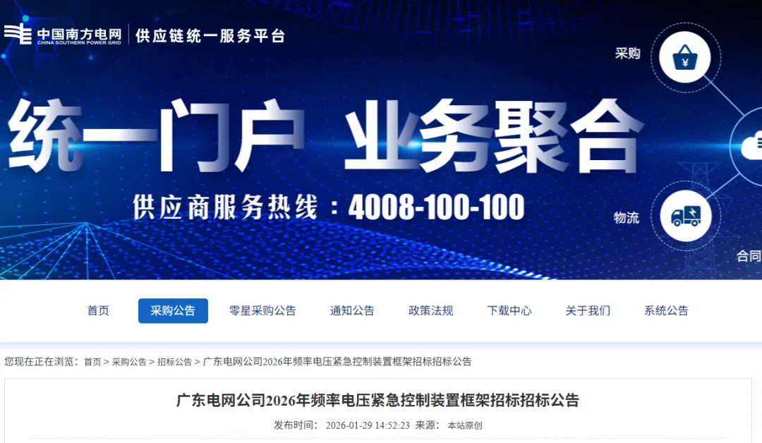广东电网公司2026年频率电压紧急控制装置框架招标招标公告