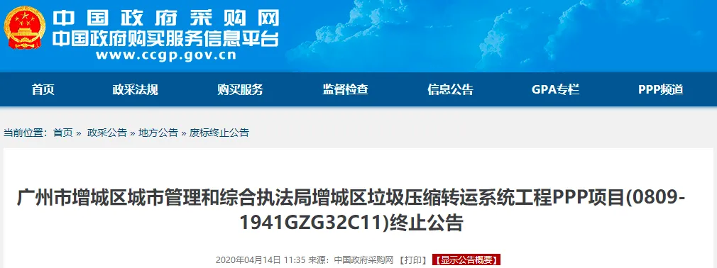 4月14日,广州市增城区垃圾压缩转运系统工程PPP项目发布终止公告,终止原因为:接采购人通知,本项目因区政府工作部署要求,采购内容发生重大变更,终止本项目采购。