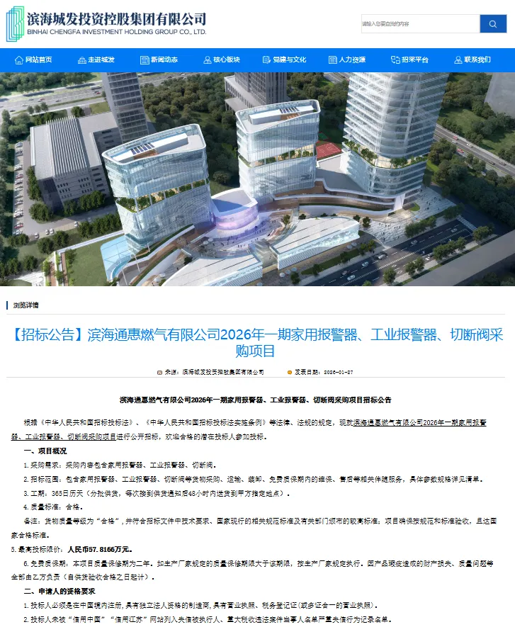 本集团的滨海通惠燃气有限公司2026年一期家用报警器、工业报警器、切断阀采购项目招标公告。欢迎广大有意向的单位参与竞标。