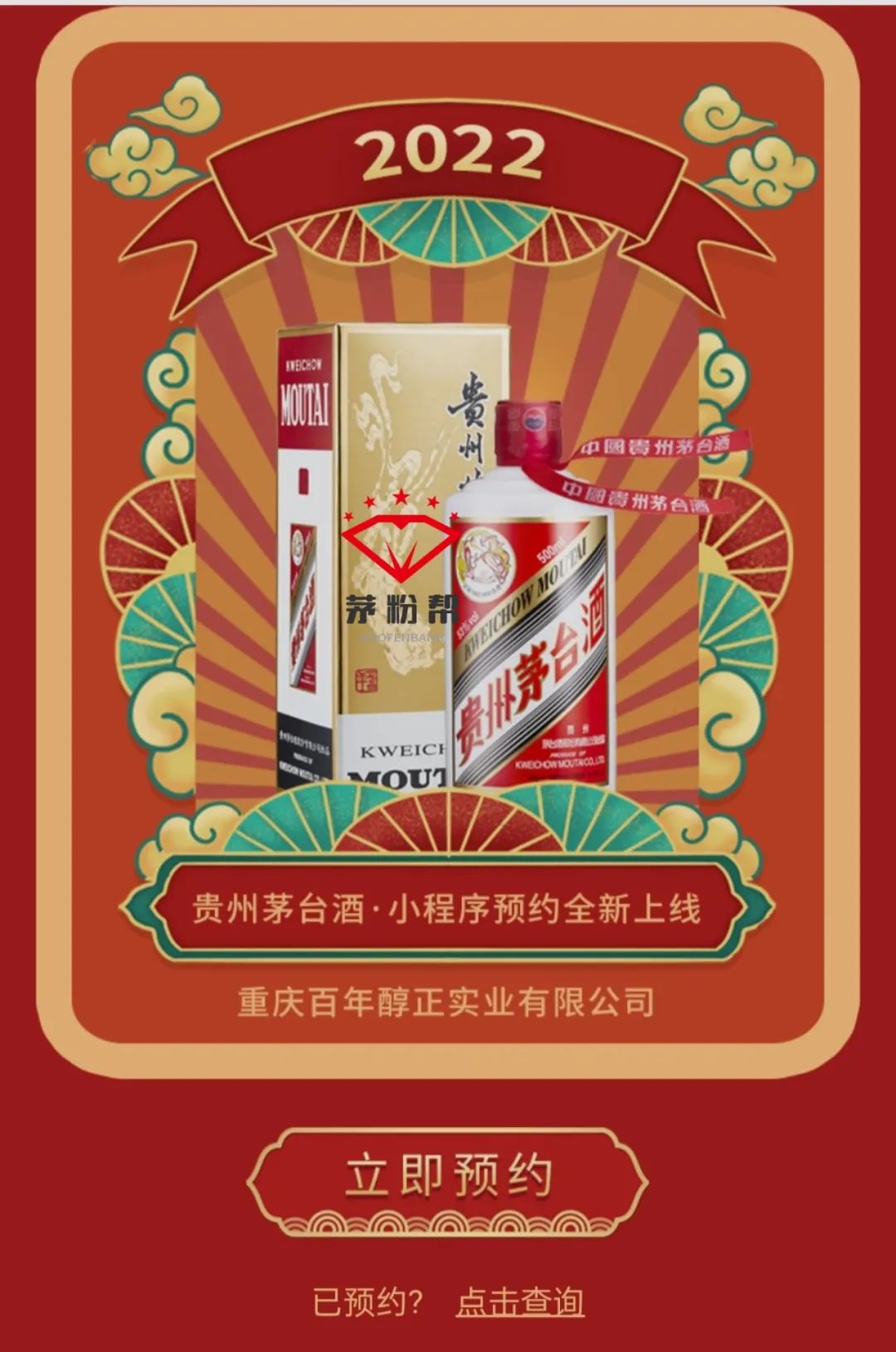 关注重庆百年醇正实业有限公司微信公众号,并通过微信公众号留言(留言内容发送:预约茅台,内容包括:姓名、手机号、身份证号码、身份证地址)