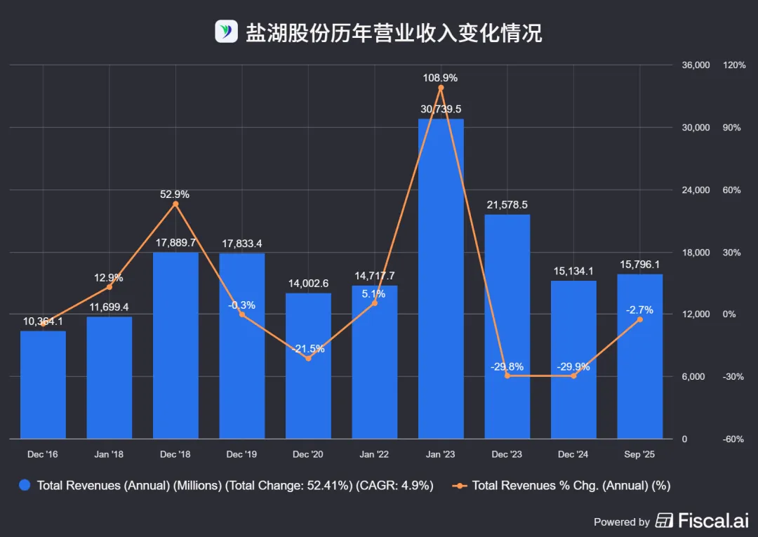 2024年,盐湖股份的营业总收入为151.34亿元,较上年同期下降29.86%;2025年三季报,盐湖股份的营业总收入为111.11亿元,较上年同期增长6.34%。